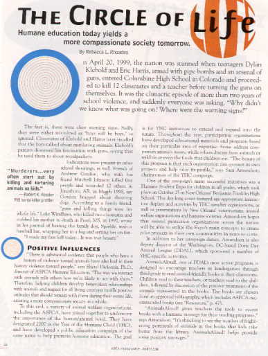 "A HUMANE EDUCATION TODAY, YIELDS A MORE COMPASSIONATE SOCIETY TOMORROW" 2. The FBI and ASPCA Research shows that not only do serial killers, domestic violence, and child abuse cases have a history of animal abuse, but that the teens involved in the high school shootings also had a history of animal mutilation and abuse. In the ASPCA 2000 magazine, each case of high school shootings documented these important warning signs in the killers' background: